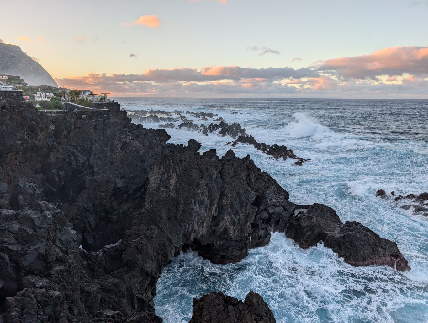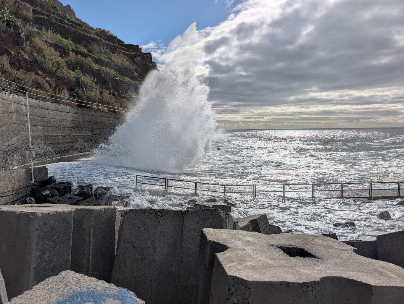 Nach einem herzlichen Abschied gingen wir eine „Dorfrunde“, freuten uns abermals über die heute echt hohen Wellen und fuhren dann nach Calheta zum Einkaufen und – endlich – Baden. Danach hatten wir an der Beachbar einen Poncha bzw. Bica und fuhren weiter nach Paul do Mar zum „Mittagessen“ (da war es schon weit nach Mittag) zu „unserem“ Lieblingsgasthaus. Und von dort ging es dann sehr gemütlich bis hierher: Porto Moniz, wo wir ein Penthouse-Apartment haben mit Blick direkt hinunter auf den Ort – besser könnte die Aussicht nicht sein!